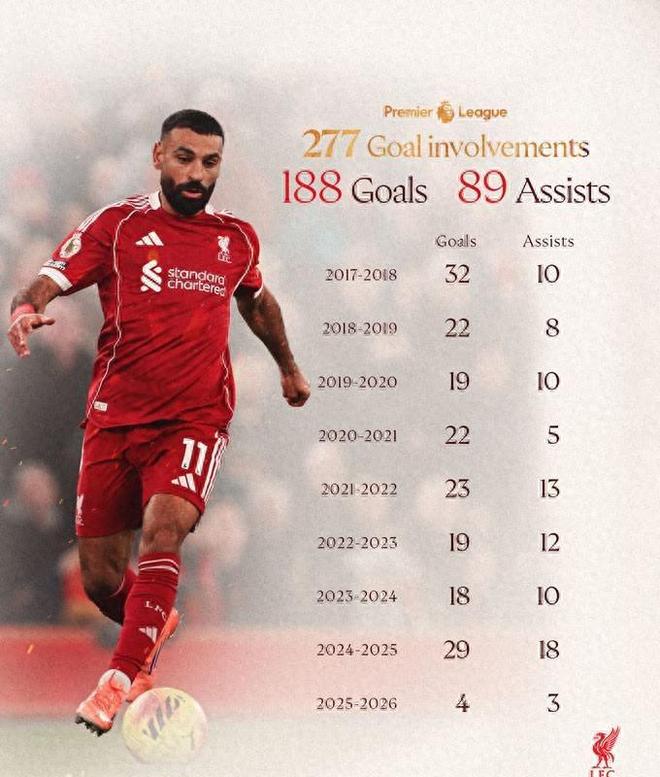 更重要的是,凭借这次助攻,萨拉赫职业生涯为利物浦在英超联赛中直接参与的进球数达到277次(188个进球 + 89次助攻),正式超越鲁尼为曼联贡献的276次(183球 + 93助),成为英超历史上为单一俱乐部参与进球最多的球员。